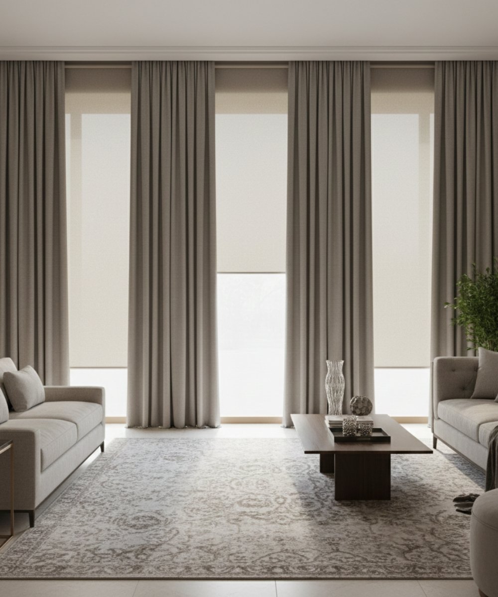 Premium window treatment featuring thick fabric curtains paired with modern roller blinds for a luxury look.